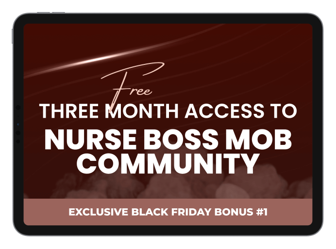 Exclusive Black Friday Bonus #1: FREE Three Month Access To The Nurse Boss Mob Community: Get Complete Access To The Ultimate Community And Resource Hub For Nurses And Healthcare Professionals Who Want To Start Or Grow Their Own Business… And Create A Life Of Wealth, Freedom, And Impact. Whether You Are Just Starting Out Or Already Have A Successful Business, NBM Has Everything You Need To Achieve All The Success You Want.